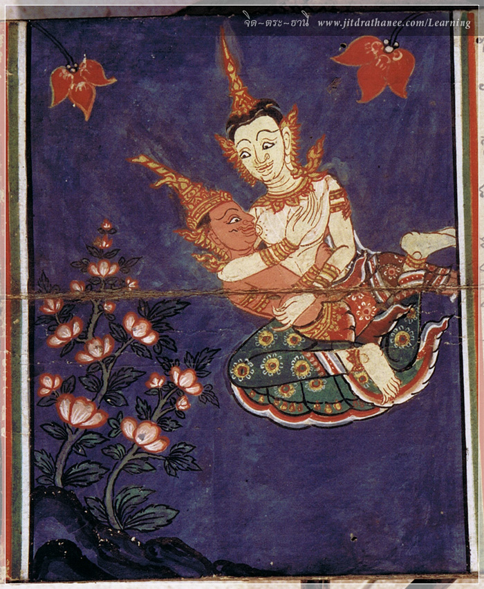 (ภาพบน) พระมหาชนกได้ออกเรือสำเภาไปค้าขายยังสุวรรณภูมิ แต่ในระหว่างทางเรือต้องพายุใหญ่จนล่มลง ลูกเรือตายหมด พระมหาชนกรอดเพียงผู้เดียว ทรงอดทนว่ายน้ำในมหาสมุทรด้วยความเพียรถึง ๗ วัน ๗ คืน จนได้พบกับนางมณีเมขลา เมื่อนางได้สนทนาธรรม (เพื่อลองใจพระมหาชนก) จนพอใจแล้ว นางเทพธิดาผู้รักษามหาสมุทร จึงได้อุ้มพระมหาชนกไปส่งยังมิถิลานคร (ดังภาพล่าง) และต่อมาได้ผจญภัยต่ออีกหลายเรื่องจนจบ สำหรับภาพล่างนี้ผมดูแล้วขำๆ จะหาว่าผมคิดลึกก็ได้นะ ว่า..ทำมั้ย..ทำไม? ริมฝีปากของพระมหาชนก ถึงไปชนเป๊ะ! กับยอดถันของนางมณีเมขลาได้อย่างพอดิบพอดี (ออกอีโรติก [Erotic] นิดๆ ^_^) หะๆ ผมว่าน่าจะเป็นอารมณ์ขันของช่าง (หรืออาจจะบังเอิญก็ได้นะ...อิอิ) ชมกันเพลินๆ นะครับ : จิด-ตระ-ธานี |