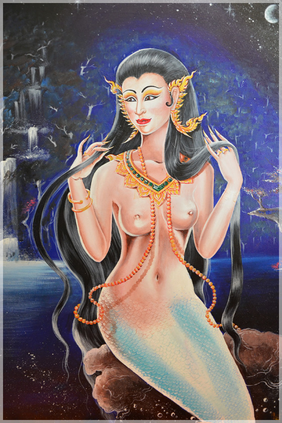 รูปนี้ที่ผมมองแล้วรู้สึกว่า ควรปรับอีกหน่อย ก็คือ สัดส่วนความสมดุลย์ระหว่าง บ่าซีกซ้ายกับบ่าซีกขวา เมย์เห็นมั้ยครับ ถ้าเมย์ขีดเส้นแบ่งกึ่งกลางระหว่างลำตัว จากศรีษะ ไปลำคอ มาช่วงอก ไล่ไปจนถึงสะดือ จะเห็นชัดเลยว่า บ่าฝั่งขวา (ด้านที่มือคว่ำ) กับบ่าฝั่งซ้าย (ด้านที่มือหงาย เอานิ้วกรีดเส้นผมอยู่) ไม่เท่ากันเห็นมั้ยครับ เพราะบ่าฝั่งขวาดูแคบกว่า อันนี้ต้องสังเกตดีๆ นะครับ เพราะมันสั้นกว่าไม่มาก แต่...ถ้าหากไม่แก้ไขตรงลำตัว แล้วปล่อยไว้เหมือนเดิม เมย์จะต้องขยับส่วนลำคอและศรีษะ ให้เลื่อนมาทางบ่าฝั่งซ้าย อีกเล็กน้อย ก็จะทำให้สัดส่วนเงือกนางนี้ ดูแล้วสมดุลย์มากขึ้นนะครับ โดยรวมๆ แล้ว ภาพนี้ถือว่าดูดีนะครับ เส้นสายส่วนใหญ่เมย์วาดได้พริ้วสลวยทีเดียว แต่ตรงกรรเจียกจอนหู ที่ผมเคยแนะนำใน FB ไปว่าสัดส่วนดูแปลกๆ เมย์ได้นำไปแก้โดยปรับลดลง นั่นดีแล้วนะครับ แต่....เมย์ยังสามารถวาดให้สวย ได้รูปกว่านี้ ได้อีกนะครับ ผมขอแนะนำให้เมย์ดูแบบ "พระแม่ธรณีบีบมวยผม" ผลงานของ อ.จักรพันธุ์ โปษยกฤต (ศิลปินแห่งชาติ พ.ศ. ๒๕๔๓) ที่ผมเคยแนะนำ ยู โสภณวิชญ์ ไปนะครับ คลิกที่นี่ ก็จะเห็นชัดเลยว่า การวาดเครื่องทรง เครื่องประดับต่างๆ ที่งดงาม สมดุลย์ และลงตัวเป็นอย่างไร พัฒนาผลงานต่อไปนะครับ ฝีมือเมย์นี่..ไม่ธรรมดานะ ขอให้วาดเล่นๆ ให้สนุกครับ (๙ เม.ย. ๒๕๕๕)