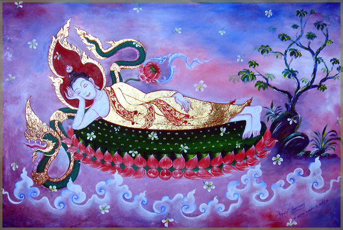 ภาพที่ ๑ : โครงภาพสำเร็จของพระพุทธเจ้าปางไสยาสน์ ฝ้ายสังเกตโครงสร้างที่ผมวาดเทียบให้ดูนะครับ สังเกตการวาดมือด้วยนะ การวาดรูปพระนอนจะให้งามก็ต้องประมาณนี้นะครับ ส่วนการวาดเศียรพญานาค (วาดได้หลายแบบ) ให้ดูเพื่มเติมที่ ต่อยอด ๑๒, ๑๓, ๑๔ นะครับ (๗ มิ.ย. ๒๕๕๑)