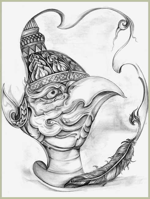 ภาพนี้กฤษณ์วาดได้สวยมากเลยนะ มีความลงตัวทั้งลายเส้นของตัวภาพที่คมอยู่แล้ว และด้านการวางองค์ประกอบ เส้นคดโค้งที่เจาะเป็นช่องเผยให้เห็นใบหน้าครุฑ ก็มีความงดงามลงตัวดีครับ ภาพนี้ใช้ได้ครับ "สอบผ่าน" เลย ถ้าลองแรเงาภายในช่องให้ดูครื้มกว่านี้อีกนิด ก็คงจะได้อารมณ์ไปอีกแบบนะครับ ขอให้วาดเล่นๆ ให้สนุกครับ