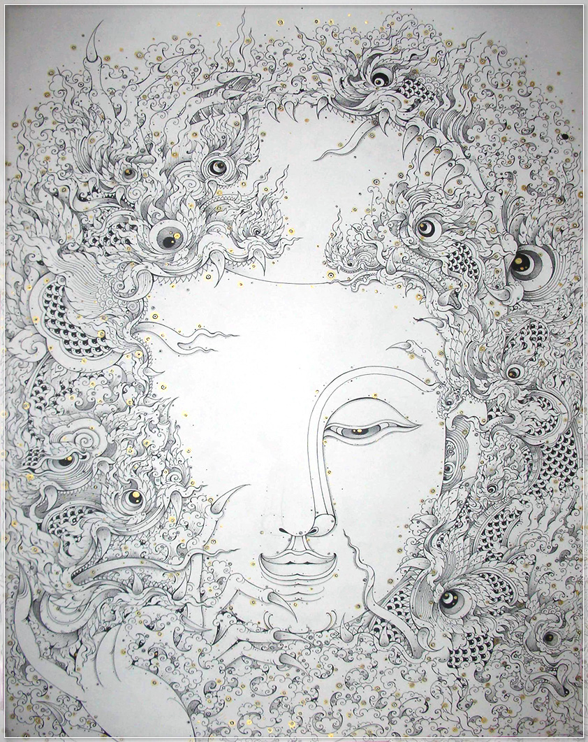 หายไปตั้งเกือบ ๒ ปี มาทักผมอีกทีใน facebook ผมเลยได้มีโอกาส เห็นภาพของเล็กอีกครั้ง จริงๆ ผลงานชิ้นนี้ไม่ได้ขี้เหร่อะไร อย่างที่เล็กกล่าวถล่มตัวมาเลยนะครับ ออกจะดีอีกต่างหาก ดูไม่ค่อยออกเลยว่า..วาดตอนอารมณ์ปั่นป่วน จริงๆ ภาพที่วาดออกมา นอกจากรูปเขี้ยวๆ และเล็บๆ แล้ว ก็ถือได้ว่ายังมีความประณีตอยู่สูงนะ ผมแนะนำว่า ครั้งต่อไปถ้าอารมณ์บูด ให้หยิบเอาปากกา + กระดาษมาวาดรูปก็ดีนะครับ (จะได้ไม่บูดใส่ภรรยาด้วย ^^..) ผมว่าเป็นทางเลือกที่ดีในการปลดปล่อยอารมณ์ ผ่านทางภาพวาดเลยนะครับ (จริงๆ สิ่งนี้เป็น "จุดแข็ง" ของพวกมีศิลปะในหัวใจทุกๆ คนเลยนะครับ) เพราะนอกจากจะไม่รบกวนใครแล้ว เผลอๆ ยังได้ผลงานที่ดีออกมา อย่างผลงานชิ้นนี้อีกต่างหาก เส้นของเล็กในภาพนี้สวยมากเลยนะครับ ไม่ทราบว่า ได้ดาวน์โหลด "พาหุง ชัยชนะแห่งพุทธะ" ที่ผมแจกให้โหลดฟรีไปแล้วหรือยังครับ..?