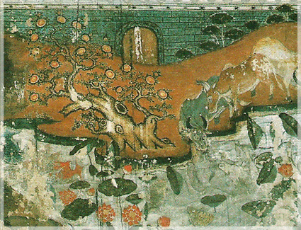 รูปบน : มาจากจิตรกรรมฝาผนัง ในพระที่นั่งพุทไธสวรรย์ (อยู่ในพิพิธภัณฑสถานแห่งชาติ กรุงเทพฯ) รูปนี้โดดเด่นที่ต้นไม้ ที่ออกช่อและแตกกิ่งก้านสาขาบิดงออย่างงดงาม กับเงาสะท้อนในผิวน้ำ