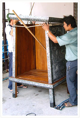 ภาพที่ ๒๐ เมื่อเสียบฝาตู้ทั้งสามด้านลงร่องไม้หมดแล้ว ช่างจะใช้เชือกยึดโครงตู้ด้านบนเข้าหากันให้ตึง แล้วจึงนำกรอบลายบัวด้านบนตู้ มาสวมให้ลงเดือยเสาตู้ทั้งสี่ด้าน ก็จะยึดโครงตู้ได้พอดี |